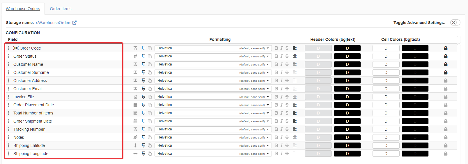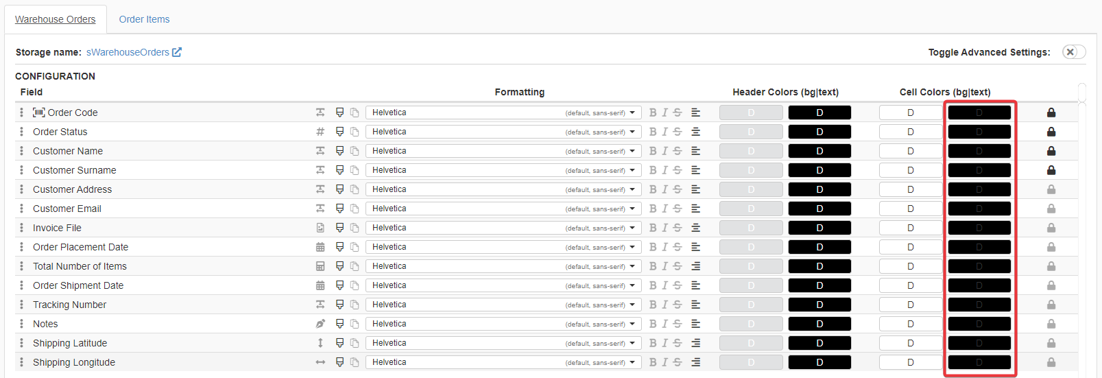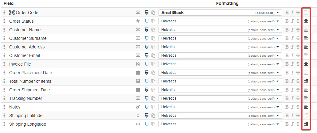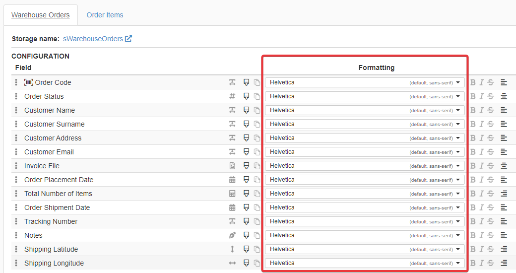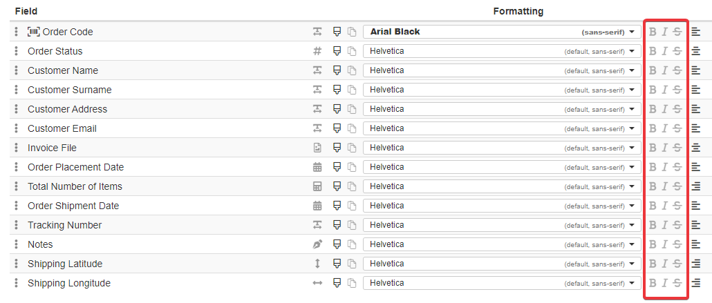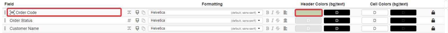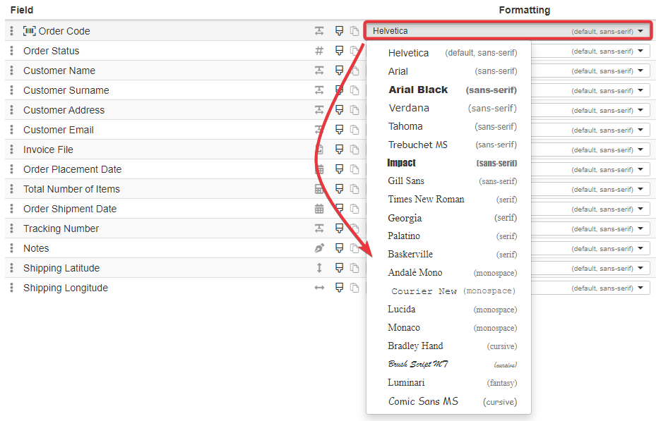 Under the Formatting column, you can choose for each field a font to format the cells.