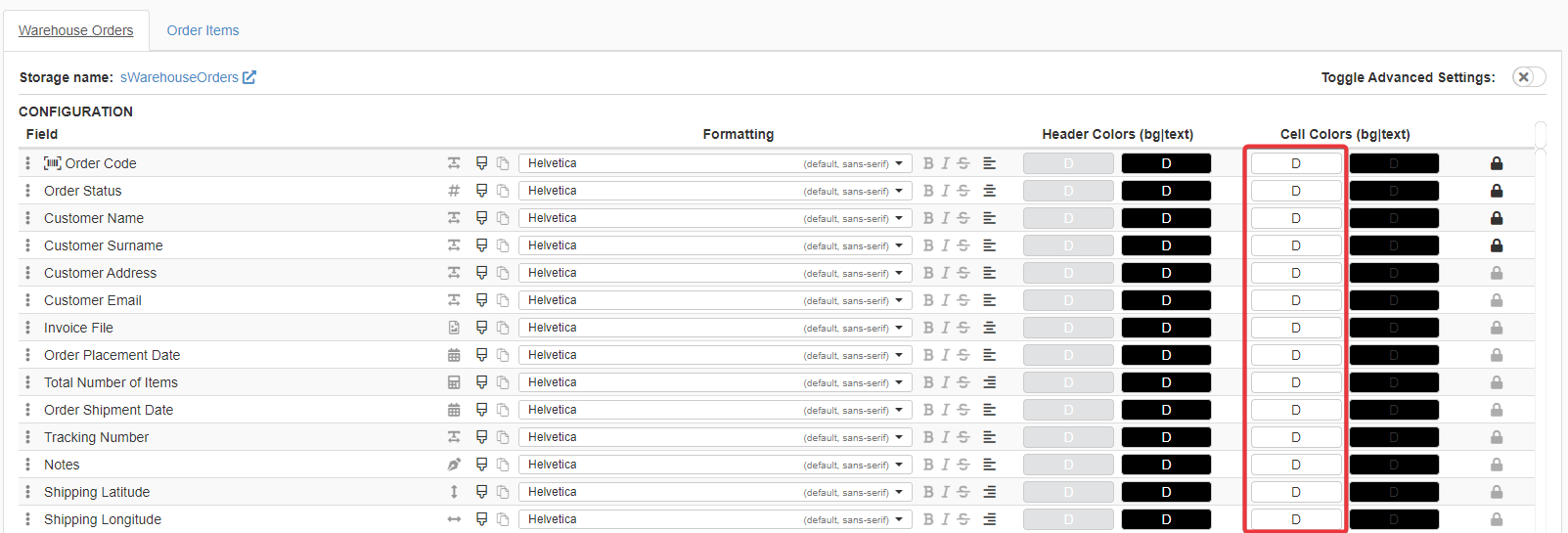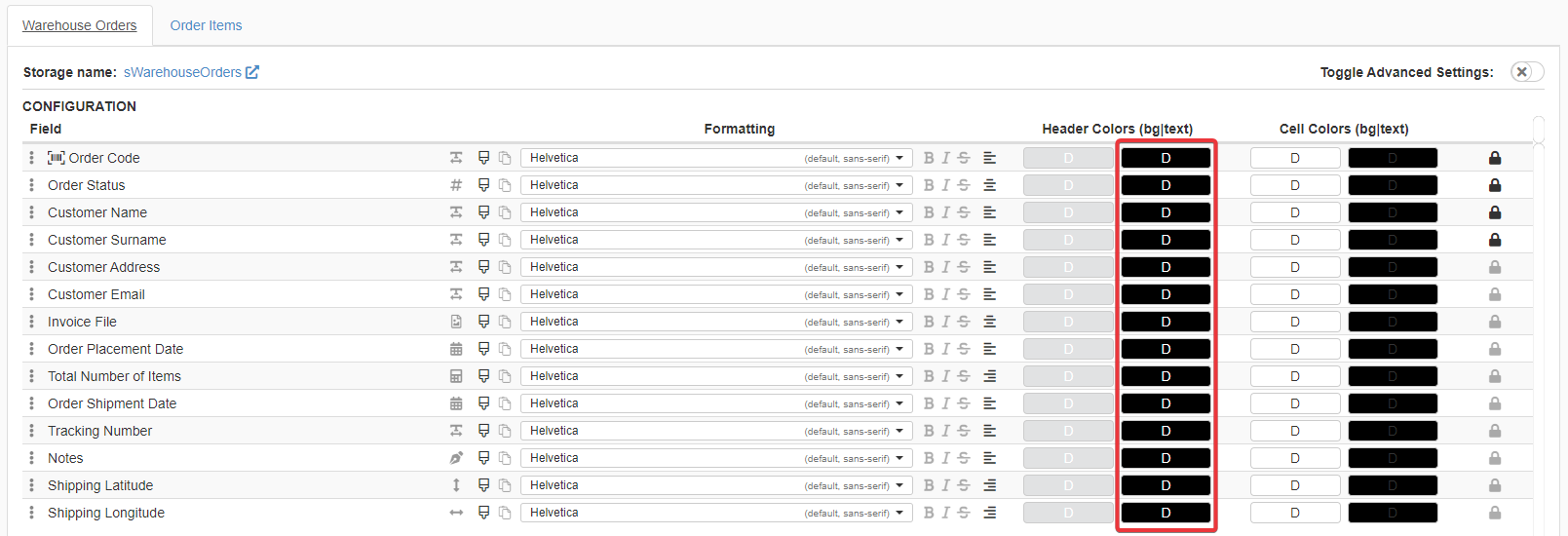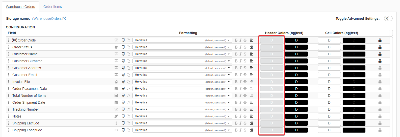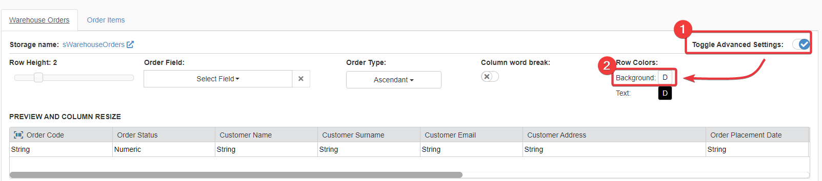 If you want to customize the entire Row Color, (1) click on the Toggle Advanced Settings and on (2) Row Colors > Background.