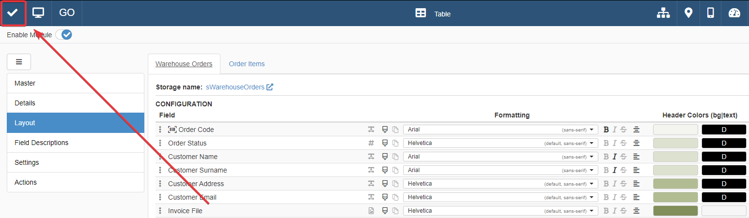 In the Layout panel, click on the tab of the table you want to customize.