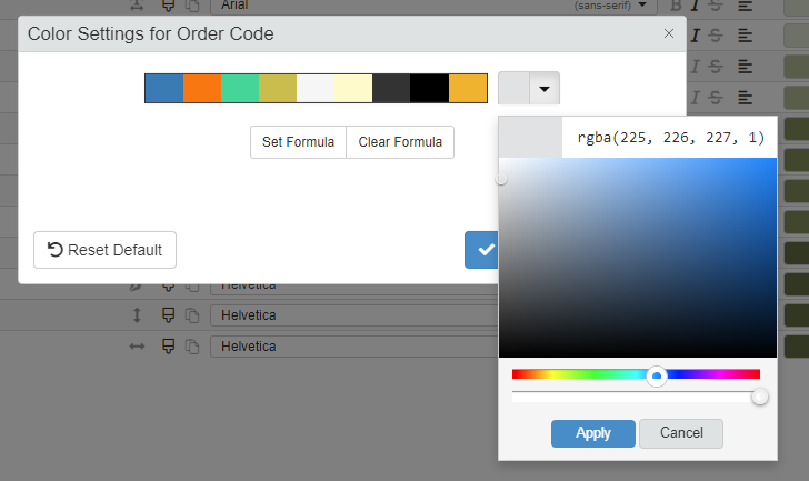 As alternative, click Set Formula to define a Formula defining what color to display. The action opens the Formula Editor to insert a Formula. The element's color will change according to the formula's condition. (Click on Clear Formula to remove the formula managing the colors.)