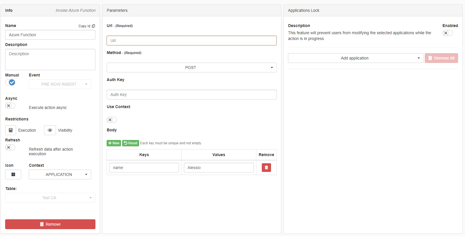 Se l'interruttore Use Context è abilitato, la Custom Action passerà il contesto della riga con i suoi valori alla richiesta.