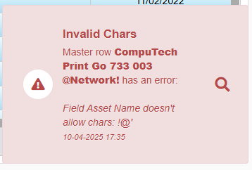 If you try to save a row containing a forbidden character, the application yields an error blocking the saving process.